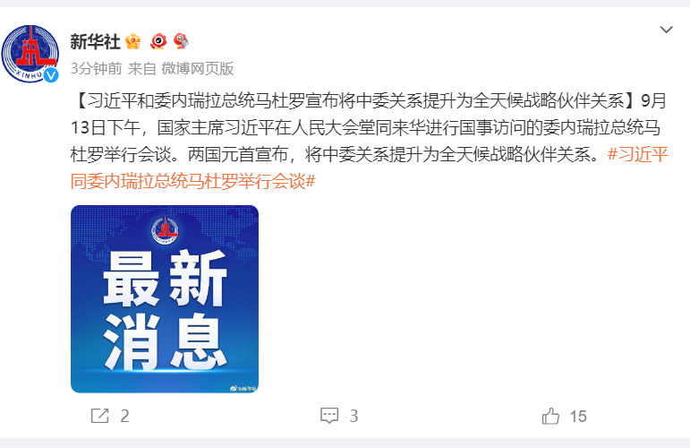 9月13日下午,国家主席习近平在人民大会堂同来华进行国事访问的委内瑞拉总统马杜罗举行会谈。两国元首宣布,将中委关系提升为全天候战略伙伴关系。