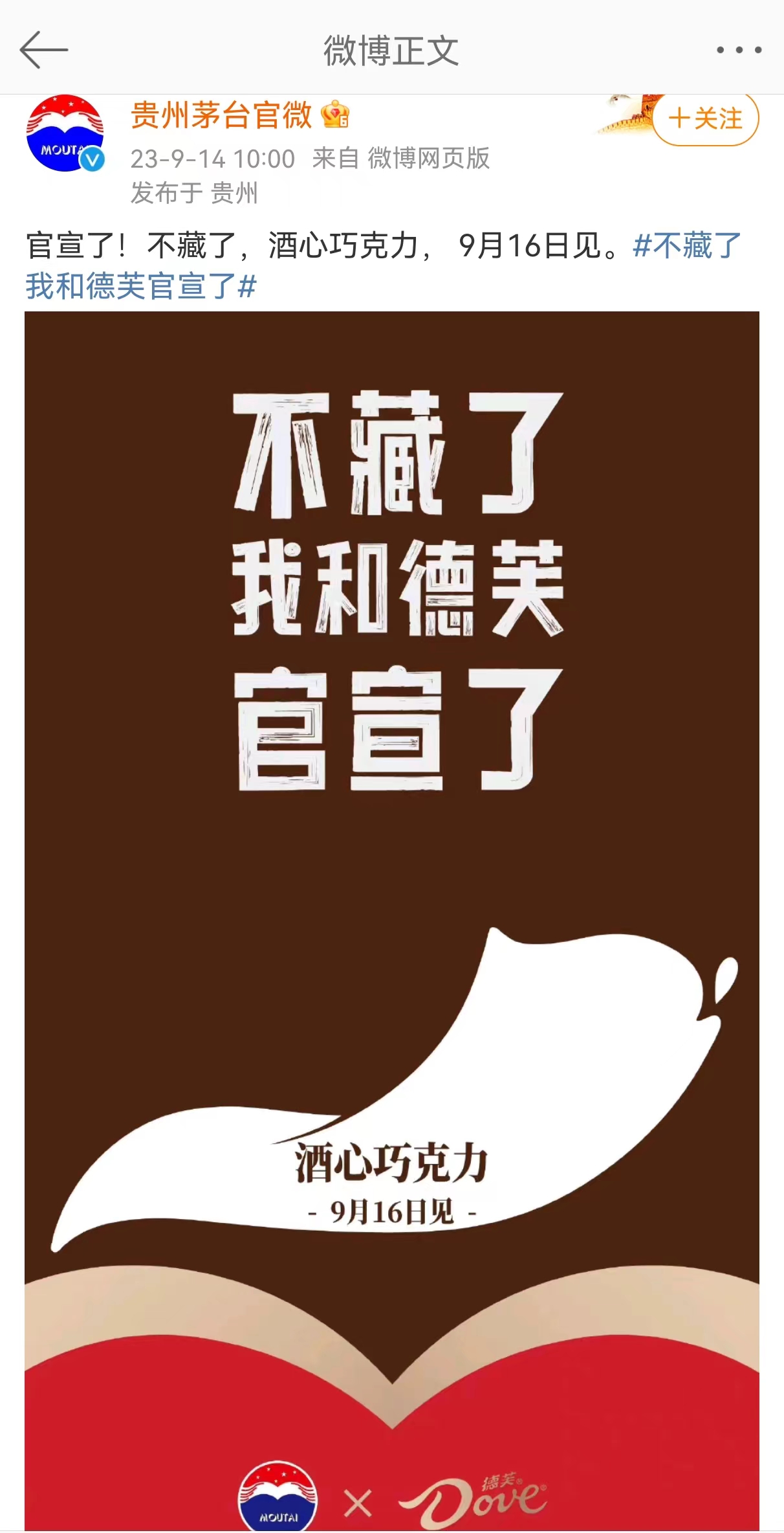 上证报中国证券网讯(记者 黎灵希)9月14日上午,贵州茅台、德芙均在微博上发布官宣海报,并配文称,酒心巧克力,9月16日见。