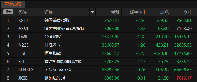 上证报中国证券网讯 据Choice金融终端数据,9月21日午间,亚太市场主要股指多数下跌。截至北京时间13时14分,韩国综合指数跌1.54%,报2520.41点;澳大利亚标普200指数跌1.33%,报7068点;日经225指数跌1.28%,报32600.57点。