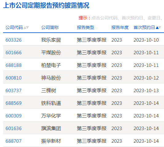 上证报中国证券网讯 据上交所消息,上交所上市公司三季报预约披露时间出炉,我乐家居拔头筹,将于10月10日率先披露。平煤股份、柏楚电子将于10月11日披露。