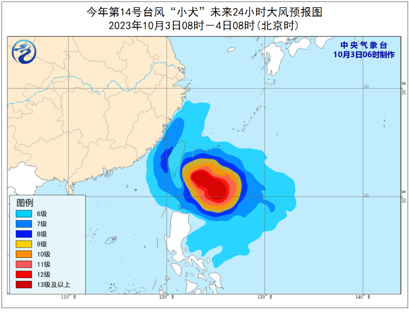 大风预报:3日08时至4日08时,东海南部及钓鱼岛附近海域、台湾以东洋面、巴士海峡、台湾海峡、南海东北部以及浙江南部沿海、福建沿海、台湾岛沿海将有6-8级大风,台湾岛东南部海面的风力将有9-12级,“小犬”中心经过的附近海面风力可达13-16级,阵风17级。