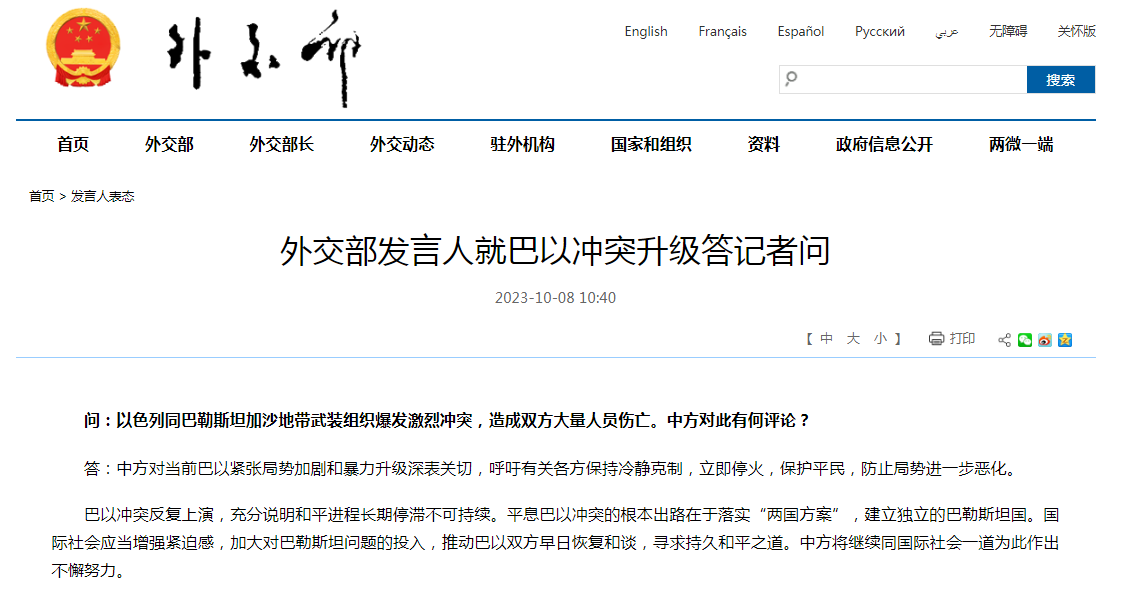 外交部发言人就巴以冲突升级答记者问