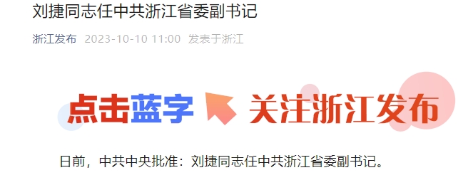 上证报中国证券网讯 据浙江发布10月10日消息,日前,中共中央批准:刘捷同志任中共浙江省委副书记。