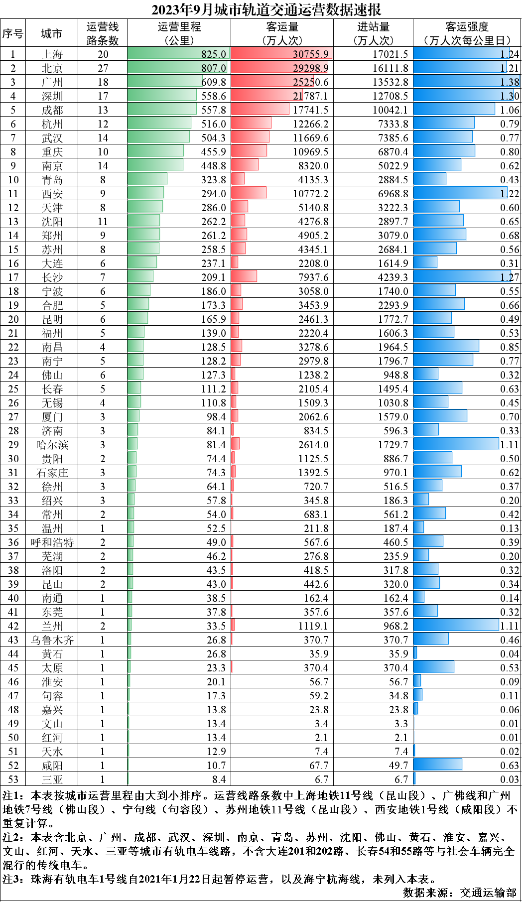 上证报中国证券网讯 据交通运输部10月10日消息,2023年9月,31个省(自治区、直辖市)和新疆生产建设兵团共有55个城市开通运营城市轨道交通线路299条,运营里程9859.5公里,实际开行列车318万列次,完成客运量24.9亿人次,进站量14.9亿人次。9月份,客运量环比减少2.2亿人次、降低8.2%,同比增加7.1亿人次、增长40%,较2019年月均客运量增加5亿人次、增长24.9%。9月份客运强度平均水平为0.536万人次每公里日,较2019年全年客运强度平均水平降低1.8%。