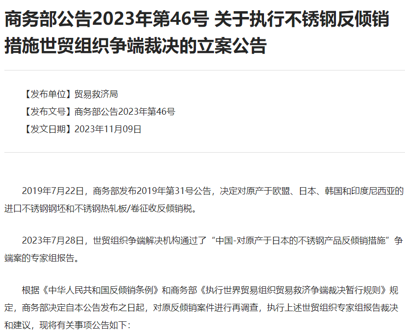 上证报中国证券网讯 据商务部11月9日消息,2019年7月22日,商务部发布2019年第31号公告,决定对原产于欧盟、日本、韩国和印度尼西亚的进口不锈钢钢坯和不锈钢热轧板/卷征收反倾销税。2023年7月28日,世贸组织争端解决机构通过了“中国-对原产于日本的不锈钢产品反倾销措施”争端案的专家组报告。根据《中华人民共和国反倾销条例》和商务部《执行世界贸易组织贸易救济争端裁决暂行规则》规定,商务部决定自本公告发布之日起,对原反倾销案件进行再调查,执行上述世贸组织专家组报告裁决和建议。