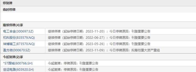 上证报中国证券网讯 11月21日,2家公司复牌:*ST园城、世运电路。