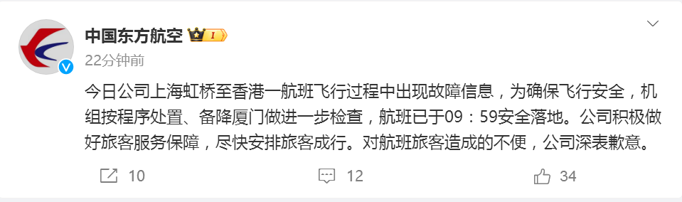 上证报中国证券网讯 据“中国东方航空”官方微博12月3日消息,12月3日,公司上海虹桥至香港一航班飞行过程中出现故障信息,为确保飞行安全,机组按程序处置、备降厦门做进一步检查,航班已于09:59安全落地。公司积极做好旅客服务保障,尽快安排旅客成行。