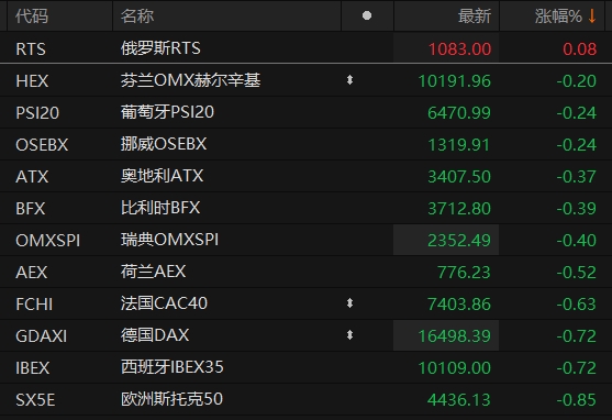 上证报中国证券网讯 1月5日欧洲市场早盘,主要股指多数走低。北京时间16时18分,欧洲斯托克50指数下跌0.85%。