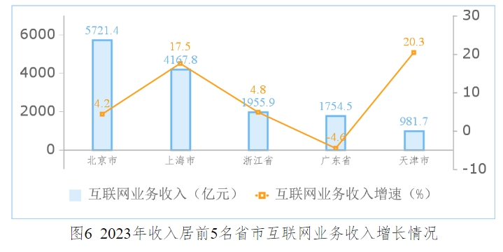 半数地区互联网业务增速实现正增长。2023年,互联网业务累计收入居前5名的北京(增长3.2%)、上海(增长17.4%)、浙江(增长4.8%)、广东(下降6.6%)和天津(增长19.1%)共完成业务收入14581亿元,同比增长7.5%,占全国(扣除跨地区企业)比重达83.4%。全国互联网业务增速实现正增长的省(区、市)有16个,数量较2022年全年增长3个。