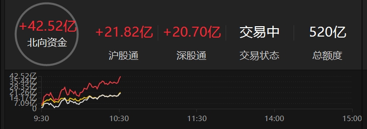 上证报中国证券网讯 截至2月6日10时32分,北向资金净流入超40亿元,达到42.52亿元。
