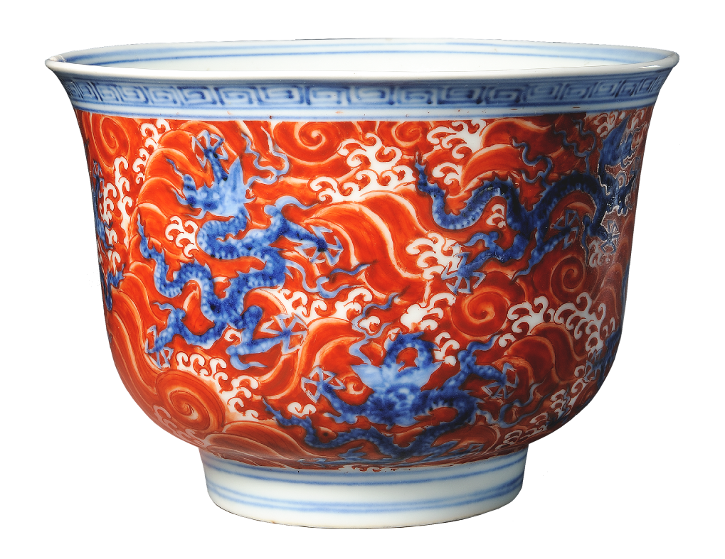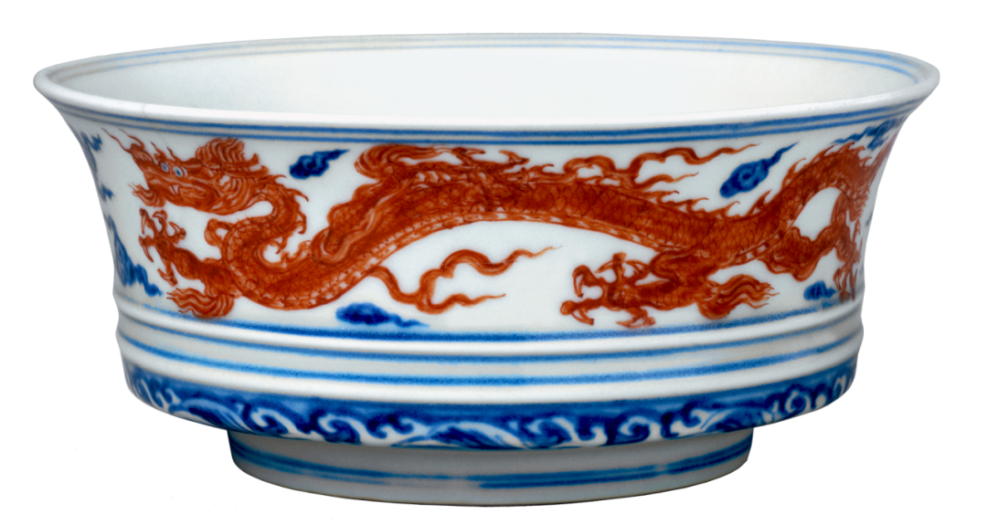明 宣德款青花海水矾红彩双龙纹折腰碗