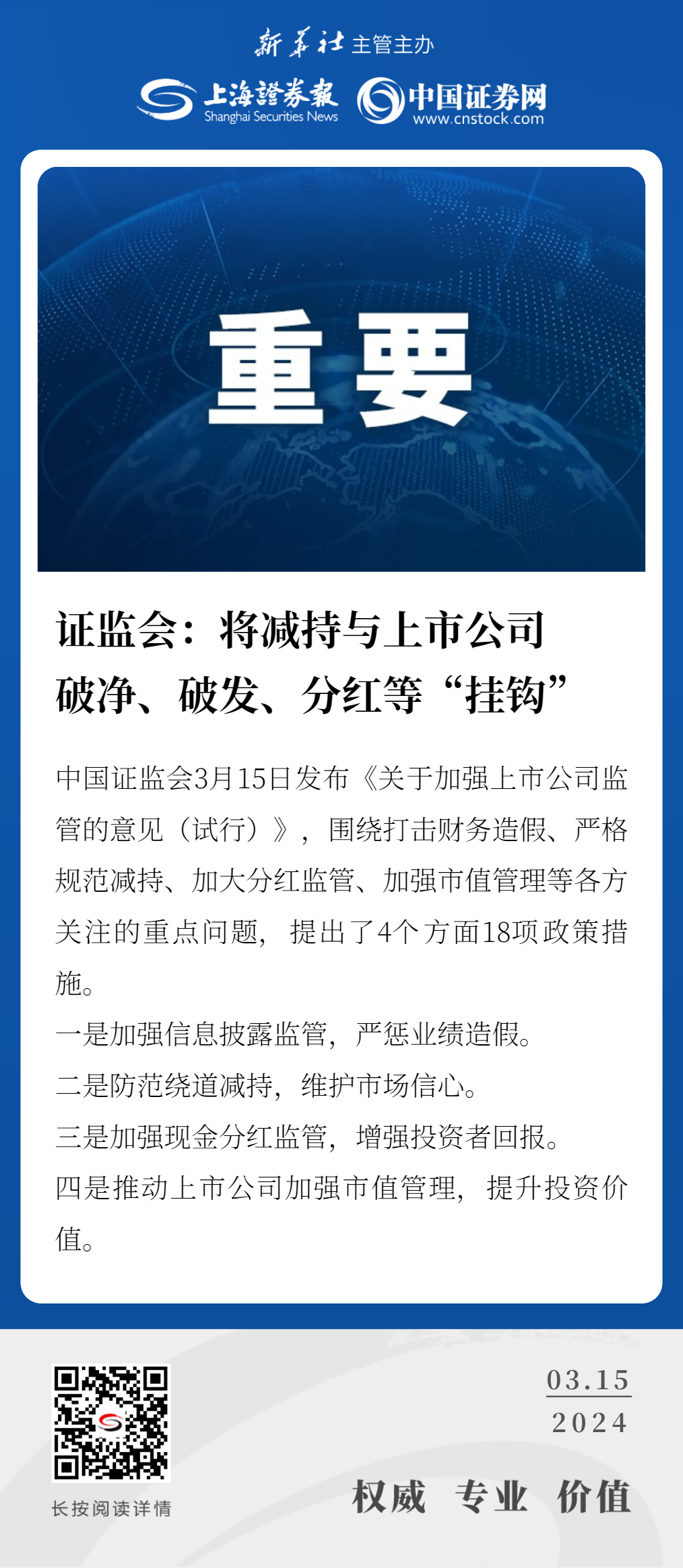 上证报中国证券网讯(记者 张雪)中国证监会3月15日发布《关于加强上市公司监管的意见(试行)》,围绕打击财务造假、严格规范减持、加大分红监管、加强市值管理等各方关注的重点问题,提出了4个方面18项政策措施。