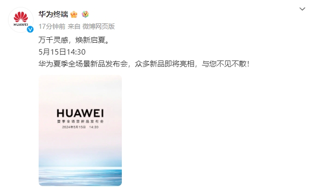 华为夏季全场景新品发布会将于5月15日举行