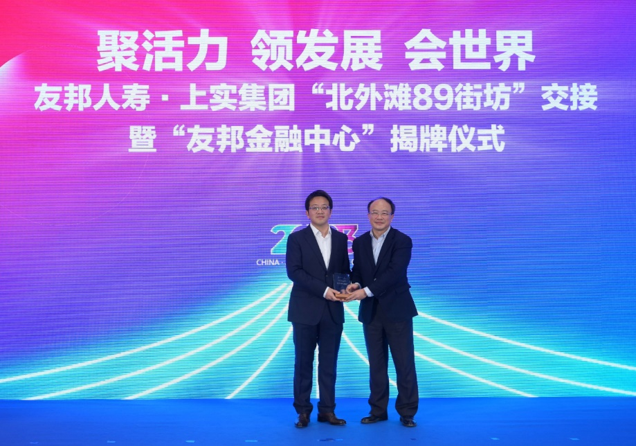 友邦人寿首席执行官张晓宇与上实发展董事长曾明进行“北外滩89街坊”交接