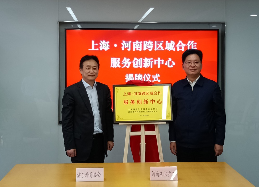 上证报中国证券网讯 近日,上海浦东外商投资企业协会与河南省人民政府驻上海招商中心战略合作协议签约仪式举行。河南省人民政府驻上海办事处主任胡加彬、招商负责人周鸿晓、上海浦东外商投资企业协会常务副会长范亚泉、副会长张涛及双方相关部门负责人参加签约仪式,范亚泉和胡加彬共同为“上海·河南跨区域合作服务创新中心”揭牌。