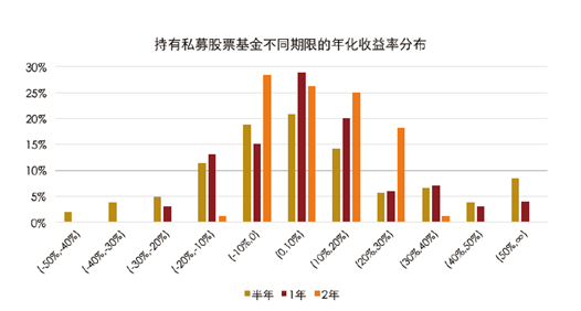 最近两年来看,以私募股票基金平均收益率来衡量,2015 年8 月以来任意时点投资并持有2 年,或者2016 年2 月以来任意时点投资并持有1 年,都获得了正收益。而持有半年则面临较大的不确定性。