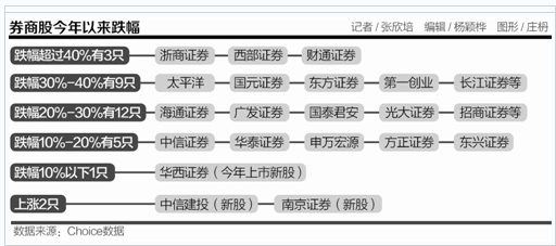 根据记者统计,今年以来,在30只下跌个股中,跌幅超过10%的有29只。其中,跌幅超过30%的有12只券商个股,超过20%的有24只个股。29只下跌个股的跌幅已经达到了27.74%。