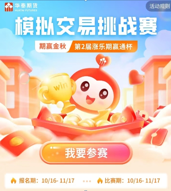 2023年 10月16日,由华泰期货主办的第2届涨乐期赢通杯模拟期货交易挑战赛开启报名。本赛事旨在通过模拟交易体验提升期货交易者的交易技能和风险管理能力,为广大参赛者提供一个进行期货交易实践、学习、交流的平台。