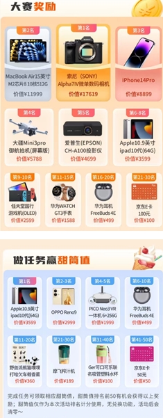 本届挑战赛采用双重奖励体系,参与比赛即有机会赢取索尼微单相机Alpha7IV、MacBookAir(512G)、iPhone14Pro、大疆航拍机Mini3pro、爱普生投影仪CH-A100、Apple iPad10代(10.9英寸64G)、Switch(国行OLED)、华为手表WATCHGT3、华为耳机FreeBuds 4E等心动大奖。前30名都有奖励!有交易实力,就能拿奖!做任务赢甜筒值(挑战赛积分),还能获取更多丰厚礼品。