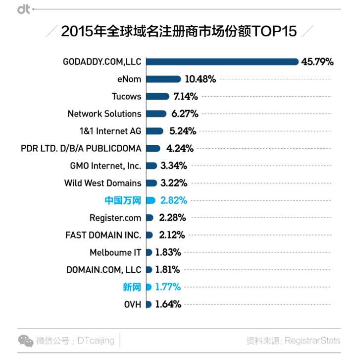 目前全球知名的域名注册商top15中,市场份额最高的就是Godaddy,达45.79%,几乎占领半边天。排在第二位的是eNom,市场份额为10.48%,远不及第一名。在前15的榜单中还有两个中国公司,分别是万网和新网。