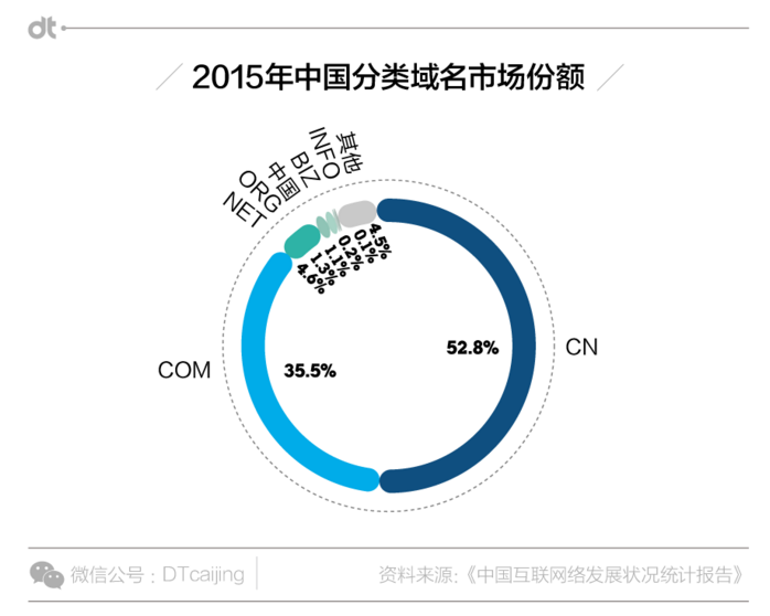 根据2016年1月最新的《中国互联网络发展状况统计报告》,“.cn”域名总数为1636万,占中国域名总数比例为52.8%,不仅如此,它还超过德国国家顶级域名“.de”,排名全球第一;“.com”域名数量为1100万,占中国域名总数35.5%,排名第二。