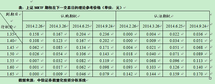 我们预计短期上证50ETF价格波动率会小幅上涨,在定价模型里设定隐含波动率为25%,并且调整无风险利率为5.5%。根据上证50ETF今天的收盘价,下个交易日上证50ETF期权合约的理论参考价格见下表。