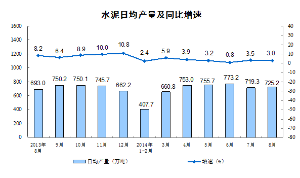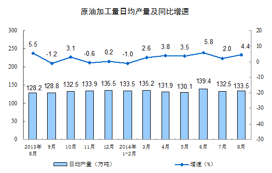 分产品看,8月份,多种产品同比增长。其中,钢材9497万吨,增长2.4%;水泥22480万吨,增长3.0%;十种有色金属370万吨,增长9.5%;乙烯147万吨,增长14.2%;汽车184.6万辆,增长3.1%;轿车101.5万辆,增长0.7%;原油加工量4139万吨,增长4.4%;发电量4959亿千瓦时,同比下降2.2%。