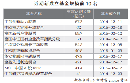 从年内基金成立情况看,新基金首募规模普遍偏大。东方财富choice资讯统计数据显示,今年以来,新基金募集规模超过20亿元的就有26只,其中3月12日成立的富国新兴产业股票基金,募集规模为59.73亿,中欧明睿新起点混合基金,募集规模为49.76亿元;华安物联网主题股票基金,募集规模为47.84亿;华夏基金发行的一只被动指数型基金MSCI中国A股ETF基金,募集规模也高达41.37亿。此外,华商健康生活、浦银安盛增长动力混合、鹏华弘盛混合、工银国企改革等基金,募集规模均超过35亿元。