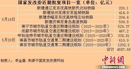 在此前的5月18日,国家发改委批复了通辽连接京沈客专快速铁路、徐州至淮安至盐城铁路、赤峰至京沈高铁喀左站铁路、济南至青岛高速铁路,以及南宁和成都的城市轨道交通近期建设规划,这6大项目总投资2435.77亿元。