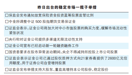 昨日上午8点30分,保监会发布通知放宽保险资金投资蓝筹股票监管比例;随后,中金所调整中证500股指期货交易保证金;9点,证监会表示,证金公司将加大对中小市值股票的购买力度,缓解市场流动性紧张状况;9点30分,央行称对证金公司提供多渠道无限流动性支持;11点,证金公司宣布已经启动新一轮融资融券工作;11点50分,国资委要求在股市异常波动期间,央企不得减持所控股上市公司股票。