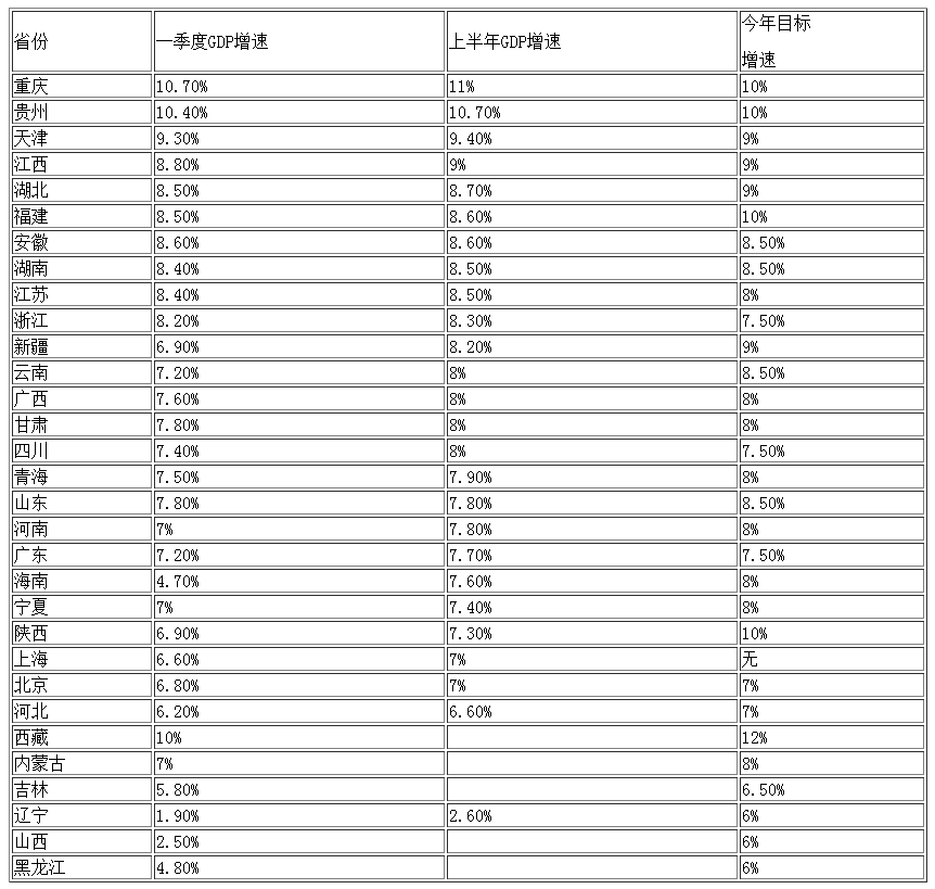 从26个省份公布的半年报看,重庆、贵州是仅有的两个GDP增速保持在两位数的省份,分别为11%和10.7%。