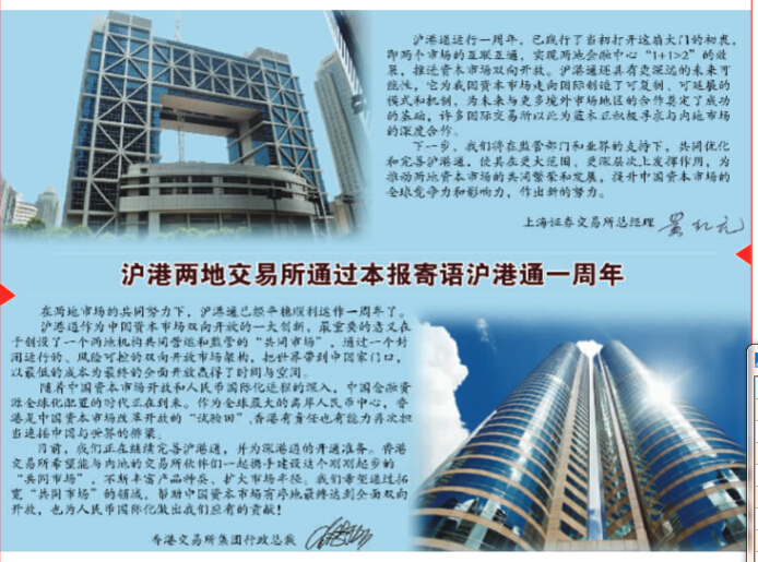 在沪港通开通一周年之际,上海证券交易所总经理黄红元与香港交易所集团行政总裁李小加,通过上海证券报对外发表“周年寄语”, “共同优化和完善沪港通”、“为深港通的开通准备”、“许多国际交易所以此为蓝本正积极寻求与内地市场的深度合作”等关键词,都让我们对一个全面互联互通新时代的到来充满期待。