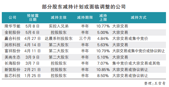 在前述公司中,隆华节能刚于5月8日披露,控股股东、实控人李占明、李占强、李明强、李明卫等四兄弟,计划在5月11日至11月11日的半年内,以大宗交易的方式减持不超过9500万股,占公司总股本的10.77%。然而,按照减持新规,每3个月大宗交易减持不超过2%的限制,并且一致行动人应合并计算,李占明四兄弟半年内合计只能以大宗交易减持4%,即使加上集中竞价交易,也只能合计减持6%的股份。