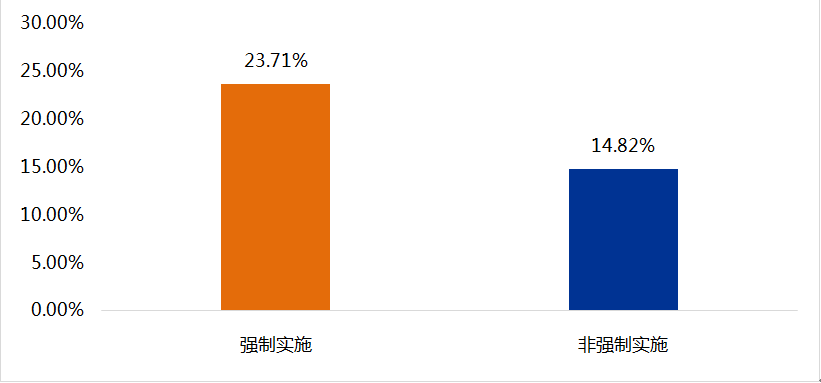 从内部控制强制实施与非强制实施上市公司评级情况来看,2018年,评级为BB及以上的强制实施内控规范的上市公司占比是非强制实施公司的1.6倍,强制实施内控规范的上市公司内部控制质量整体优于非强制实施内控规范的上市公司。如图3所示。