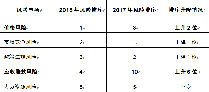 与2017年相比,2018年上市公司面临的前十大风险基本维持不变,但风险排序发生了变化。其中,价格风险由第三名上升至第一名,成为上市公司最普遍关注的风险;排名上升最大的是应收账款风险,由第十名上升至第四名。如表1所示。