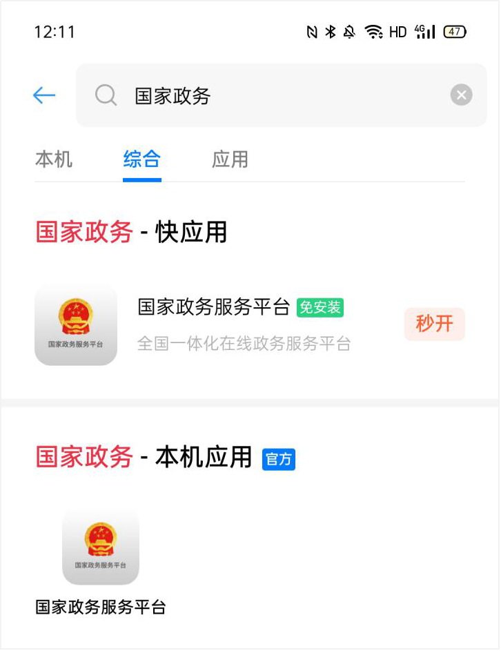 (手机全局搜索,即可找到国家政务服务平台快应用入口。)