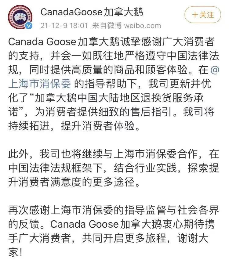 10日,记者从上海市消保委官方微信公众号获悉,12月9日晚间,加拿大鹅官方微博发布以下消息: