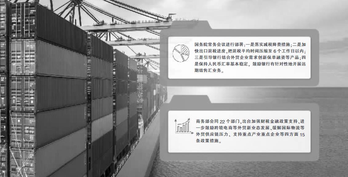 在加强对进出口的政策支持上,国务院常务会议进行部署:一是落实减税降费措施;二是加快出口退税进度,把退税平均时间压缩至6个工作日以内;三是引导银行结合外贸企业需求创新保单融资等产品;四是保持人民币汇率基本稳定,鼓励银行有针对性地开展远期结售汇业务,提升外贸企业应对汇率风险的能力。