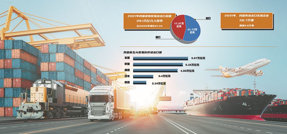 海关数据显示,2021年我国货物贸易进出口总值39.1万亿元人民币,比2020年增长21.4%。其中,出口21.73万亿元,增长21.2%;进口17.37万亿元,增长21.5%。