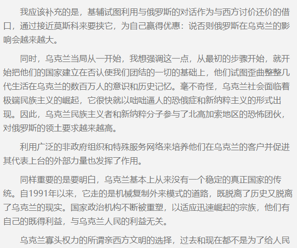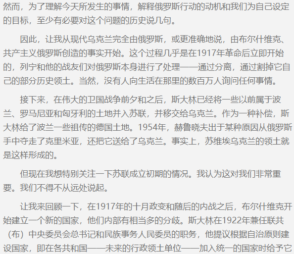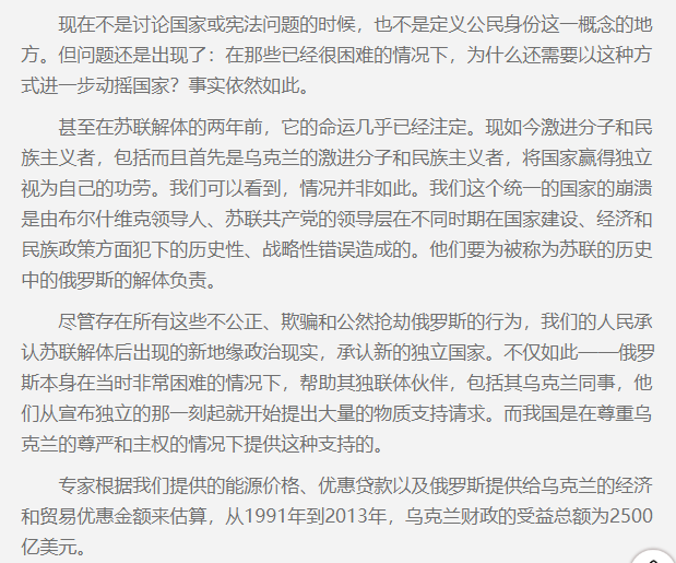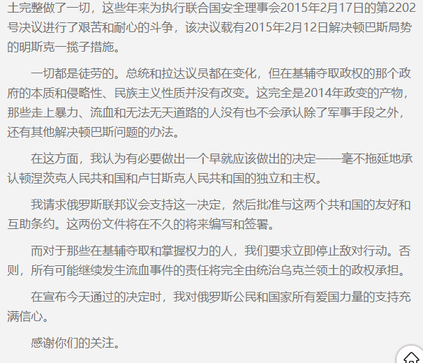 乌克兰危机风云突变。俄罗斯总统普京21日晚签署命令,承认乌克兰东部的“顿涅茨克人民共和国”和“卢甘斯克人民共和国”,并派遣俄罗斯军队进入该地区执行维和行动。同日晚,普京就乌克兰危机向俄罗斯民众发表电视讲话,信息量很大!