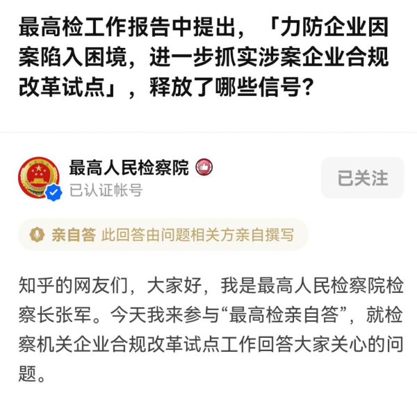 最高检张军检察长在知乎上就企业合规改革试点工作回答网友提问