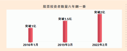 我国投资者数量稳步增长。2016年1月,股票投资者数量首次突破1亿;2019年3月,股票投资者数量突破1.5亿;2022年2月,已突破2亿大关。十年前,基金投资者不足4000万;截至2021年底,基金投资者已超过7.2亿,十年间增长了17倍。