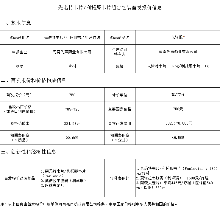 新冠治疗药品先诺特韦片/利托那韦片组合包装首发报价公示