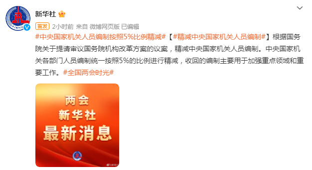 根据国务院关于提请审议国务院机构改革方案的议案,精减中央国家机关人员编制。中央国家机关各部门人员编制统一按照5%的比例进行精减,收回的编制主要用于加强重点领域和重要工作。
