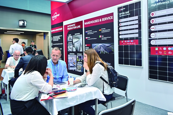 第133届广交会新能源展区内,采购商(中)与参展商洽谈
