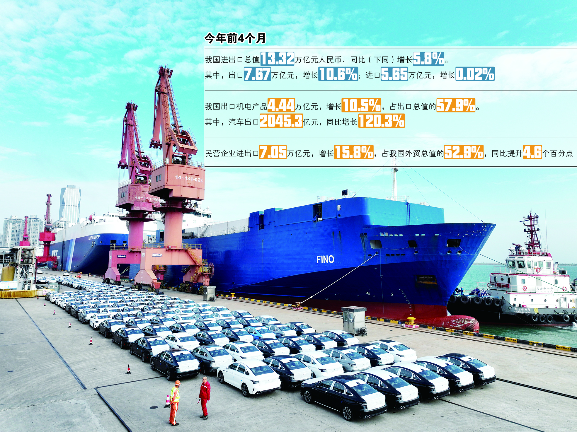 从出口产品看,前4个月,我国出口机电产品4.44万亿元,增长10.5%,占出口总值的57.9%。其中,汽车出口2045.3亿元,同比增长120.3%。