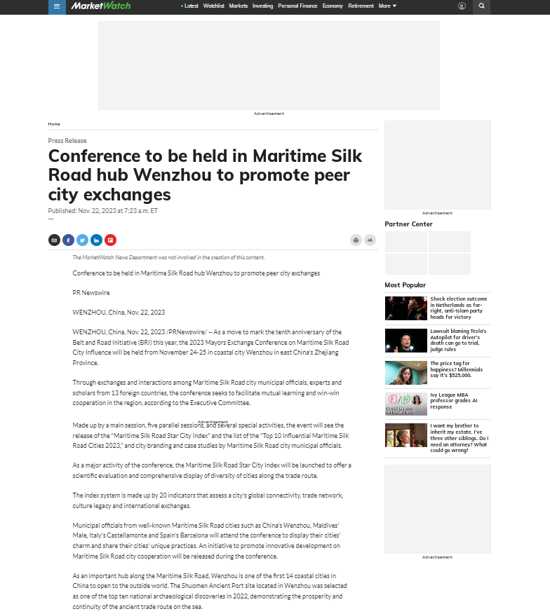 即将于11月24日至25日在浙江温州召开的2023海上丝绸之路城市影响力市长交流大会引发了全球媒体的高度关注。