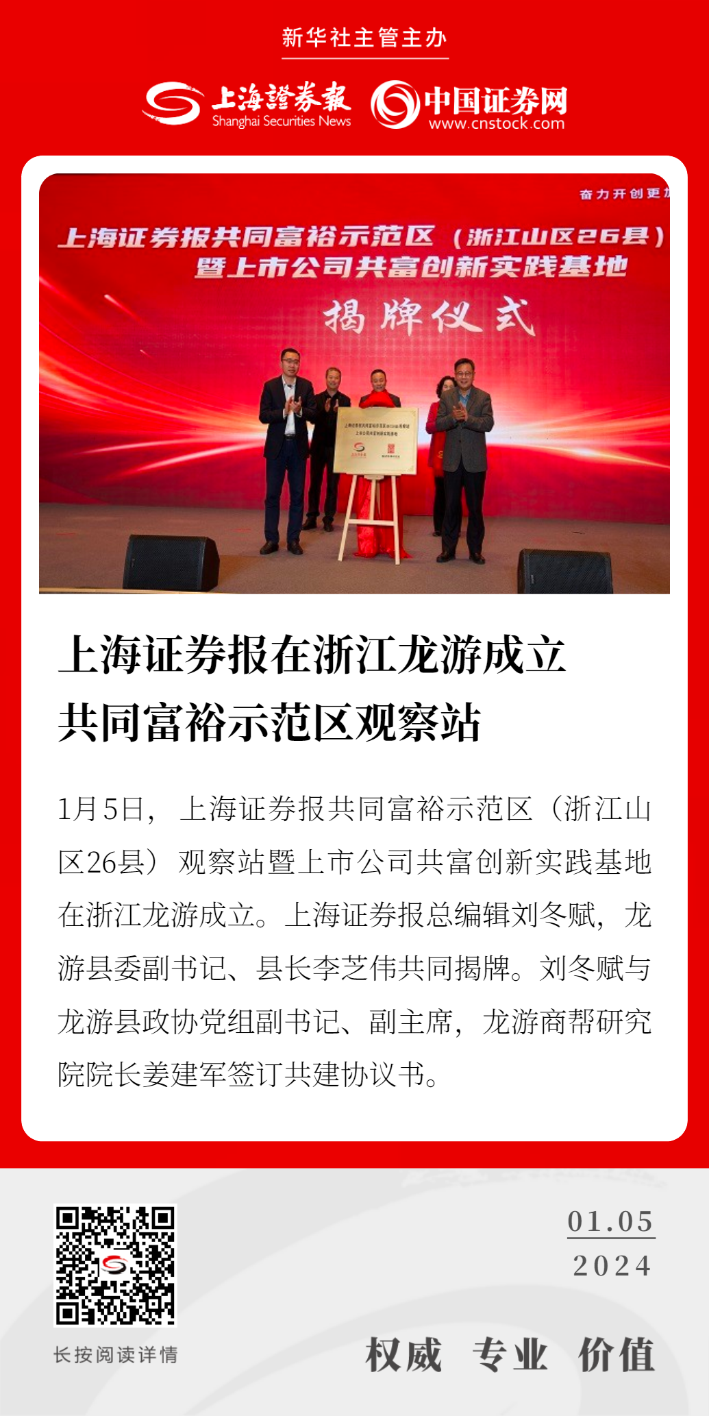 1月5日,上海证券报共同富裕示范区(浙江山区26县)观察站暨上市公司共富创新实践基地在浙江龙游成立。上海证券报社总编辑刘冬赋,龙游县委副书记、县长李芝伟共同揭牌。刘冬赋与龙游县政协党组副书记、副主席,龙游商帮研究院院长姜建军签订共建协议书。