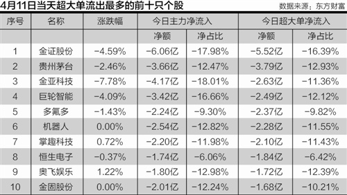 4月11日,以贵州茅台(600519)为代表的多只个股就遭遇了巨量出货的情况。东方财富数据显示,贵州茅台当日超大单净流出37882.92万元,为全市场超大单净流出排名第2名,股票跌幅为2.46%。