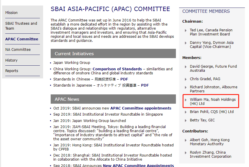 SBAI亚太委员会介绍及名单,红圈处为诺亚香港首席投资官、歌斐红树林CEO马晖洪(William Ma)。此前SBAI亚太区仅有4家机构入选了委员会,包括澳大利亚未来基金、新加坡政府投资公司、太盟投资(PAG)、Albourne Partners(全球最大的另类投资咨询公司),诺亚香港及CQS入选后,亚太区成员也将增至6位。
